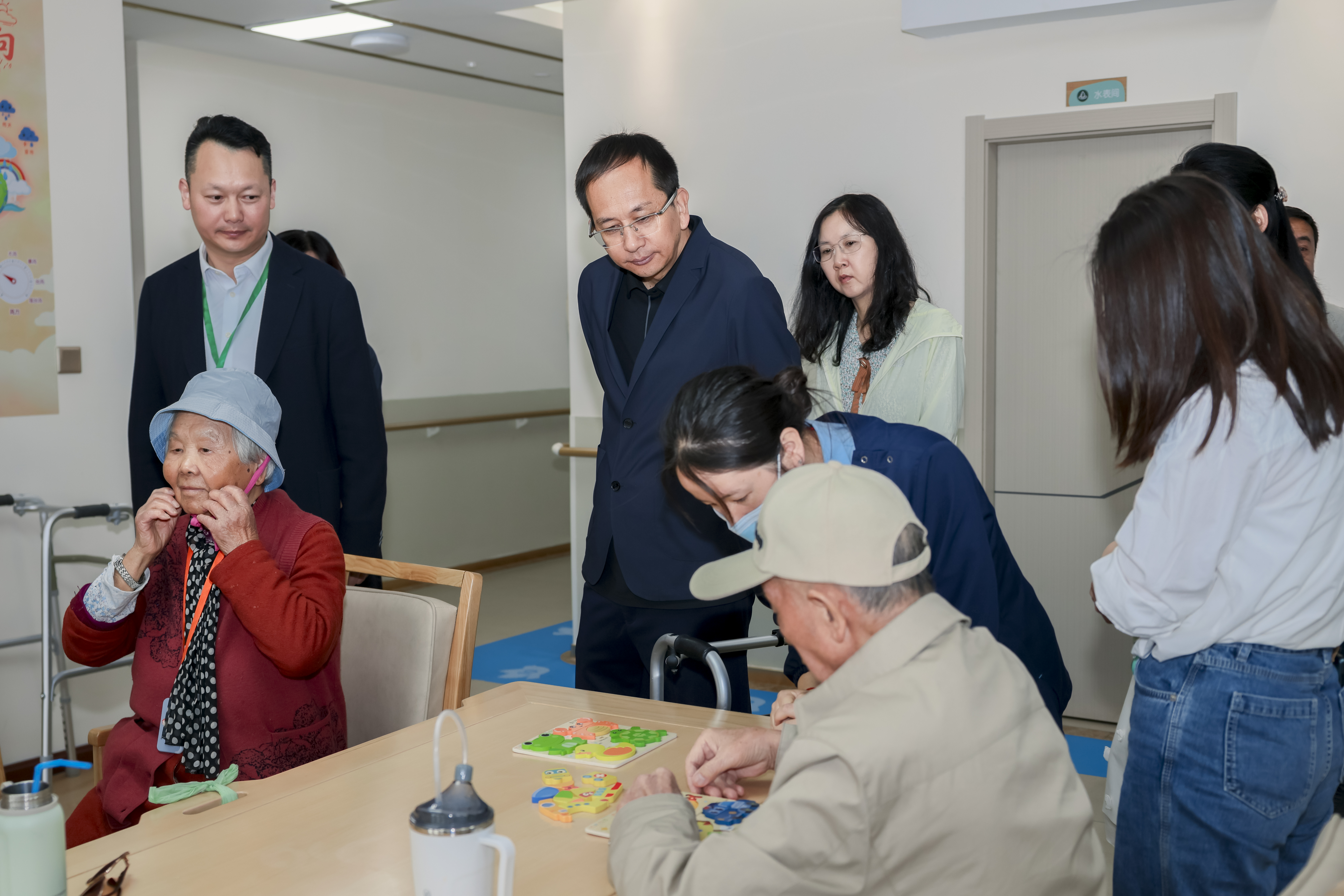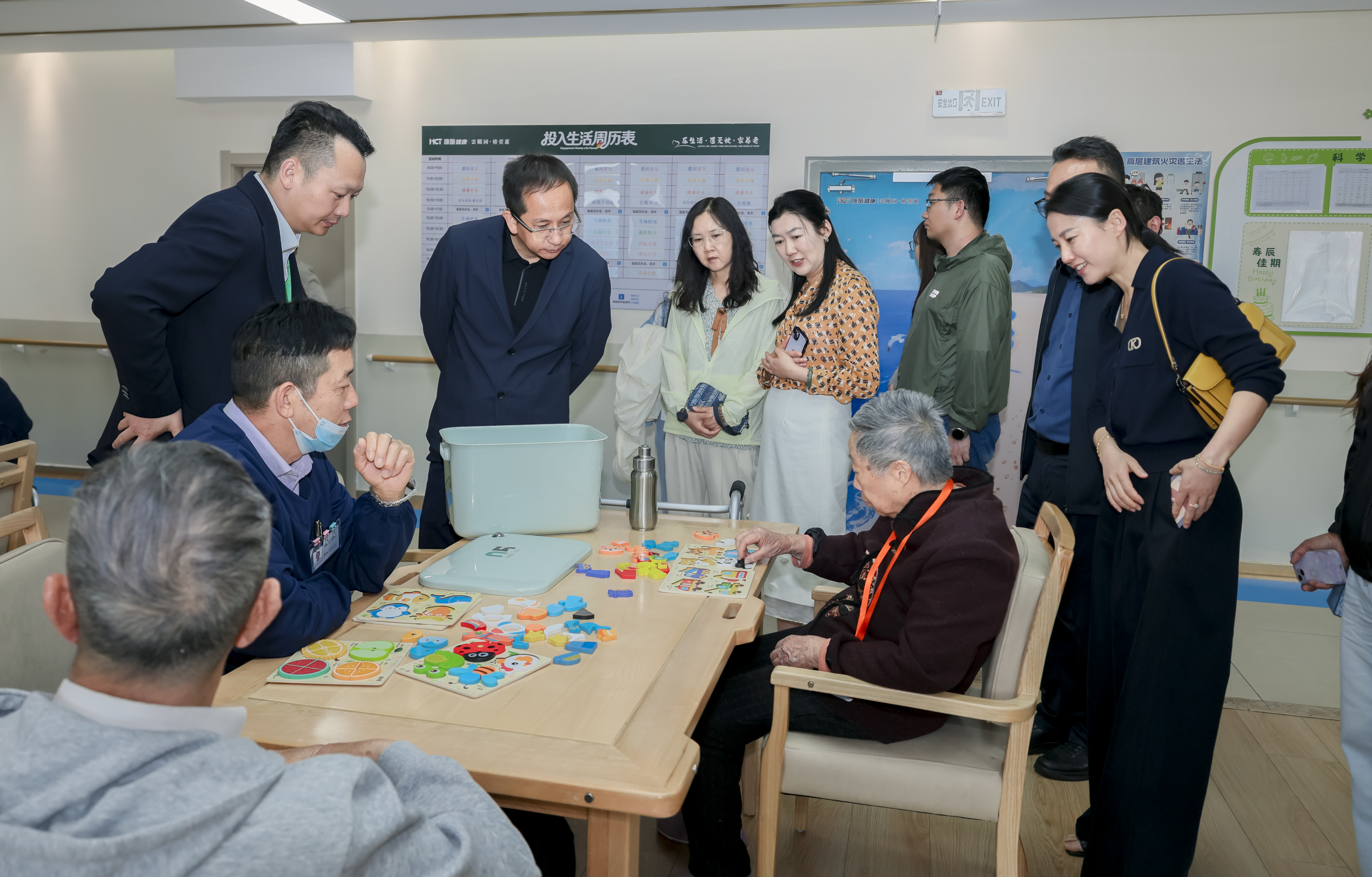 考察团先后参观活力老人文娱区、介护老人康复区、屋顶花园、营养膳食餐厅等区域,沉浸式感受专业康养服务。雲頤园・椿萱蕙总建筑面积29421平方米,配置养老床位500余张,是云南首个集医疗、养老、娱乐于一体的智慧化养老综合体。项目以“机构、社区、居家”三位一体模式为核心,打造15分钟养老服务圈,近半数面积用于医疗、文娱、餐饮等公共配套。中心为活力老人提供丰富文娱活动,为介护、失能老人提供专业康复训练与细致照护,适老化设施齐全、智慧化管理高效,获考察团高度评价。